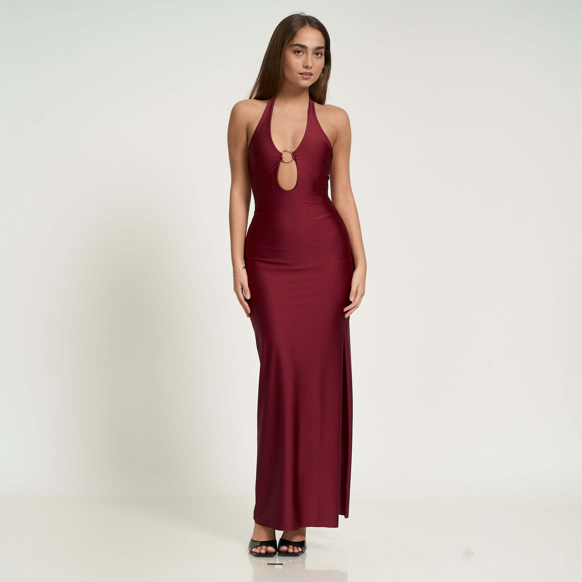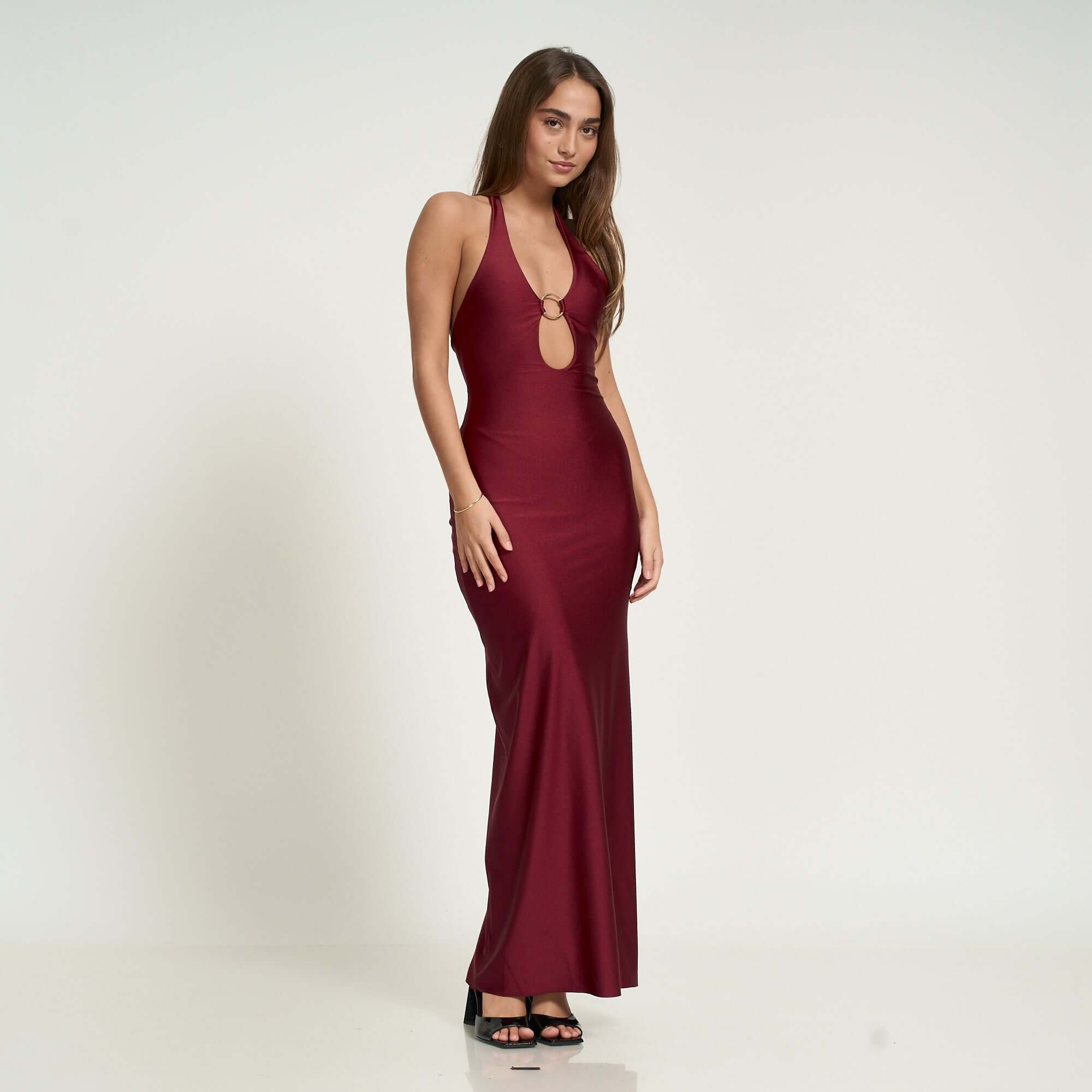 Make a statement in our Ines halter maxi dress in Burgundy, crafted in sleek stretch lycra with a flattering body-hugging fit. Featuring a daring keyhole front with golden ring hardware detail, this partially lined design offers both support and sophistication. Effortlessly chic for evening events, special occasions, or a night out, this piece is part of our exclusive collaboration with influencer Daniella Nuñez.