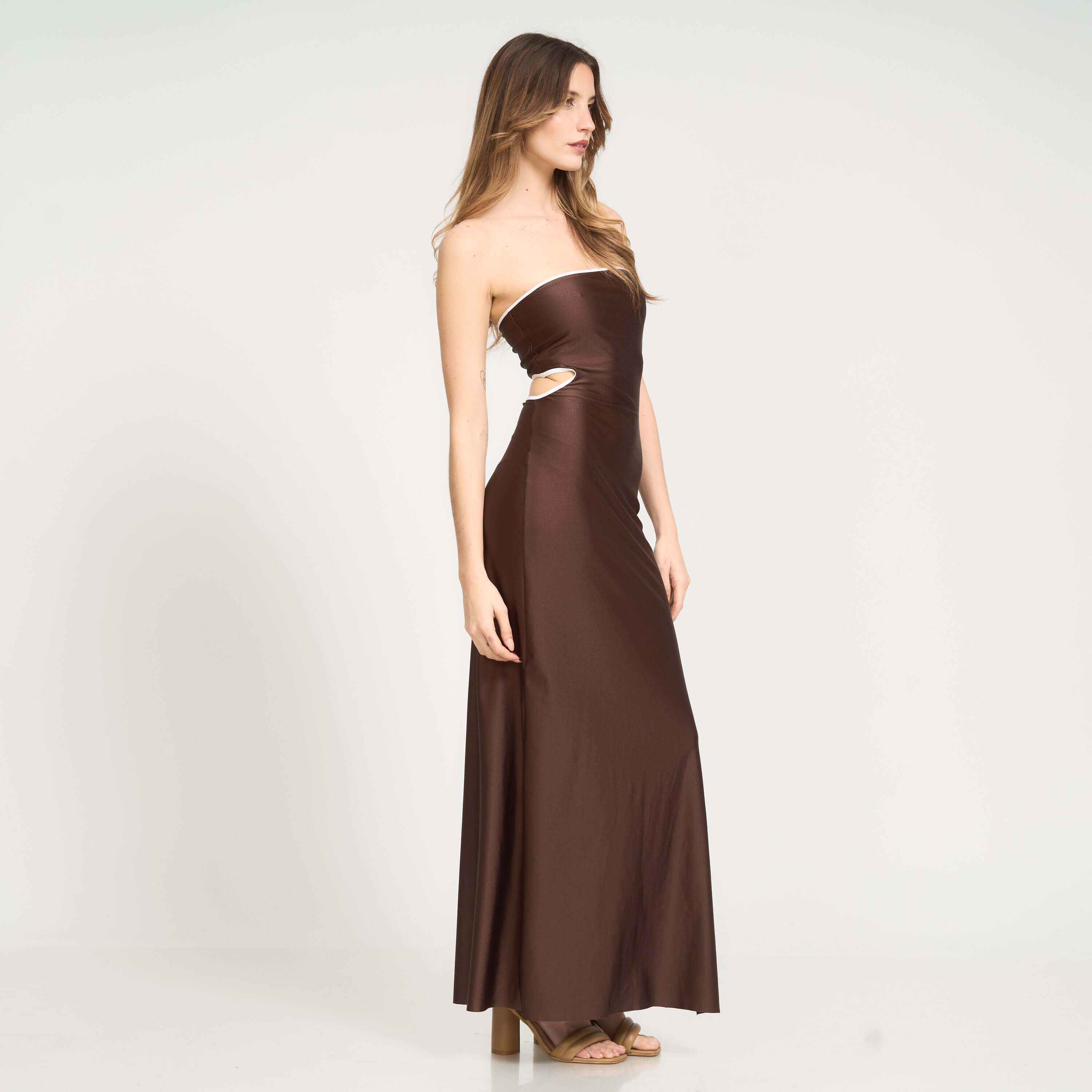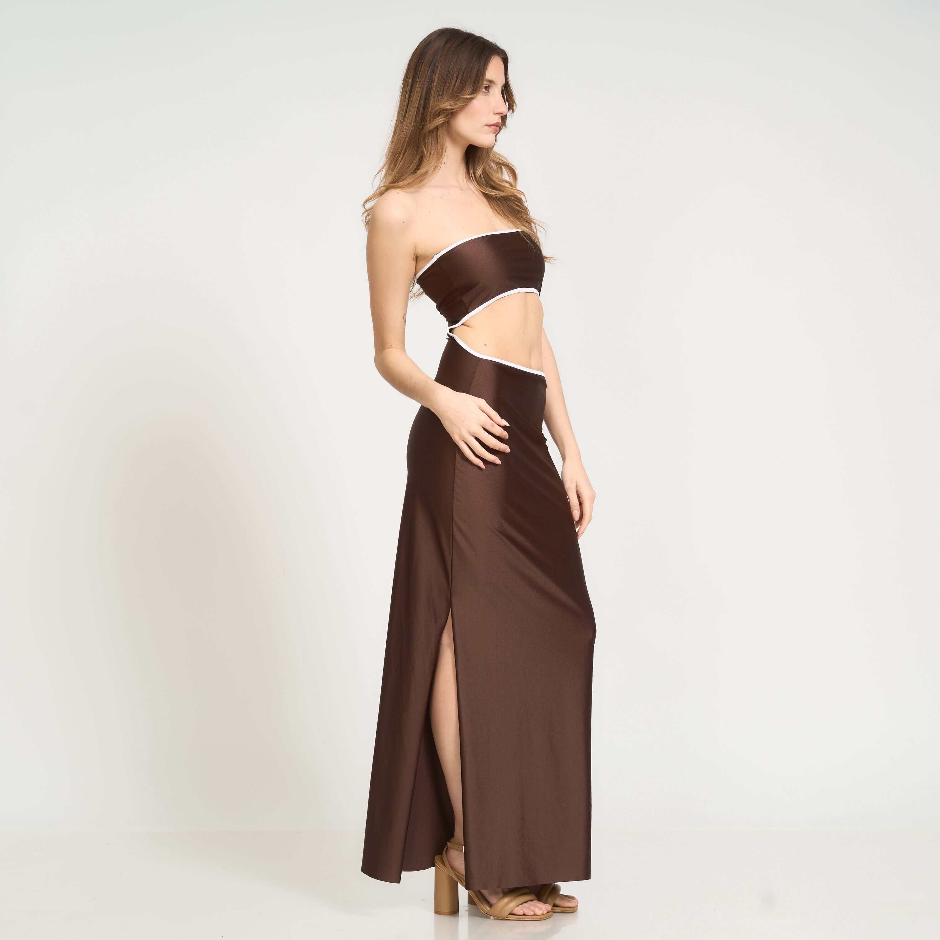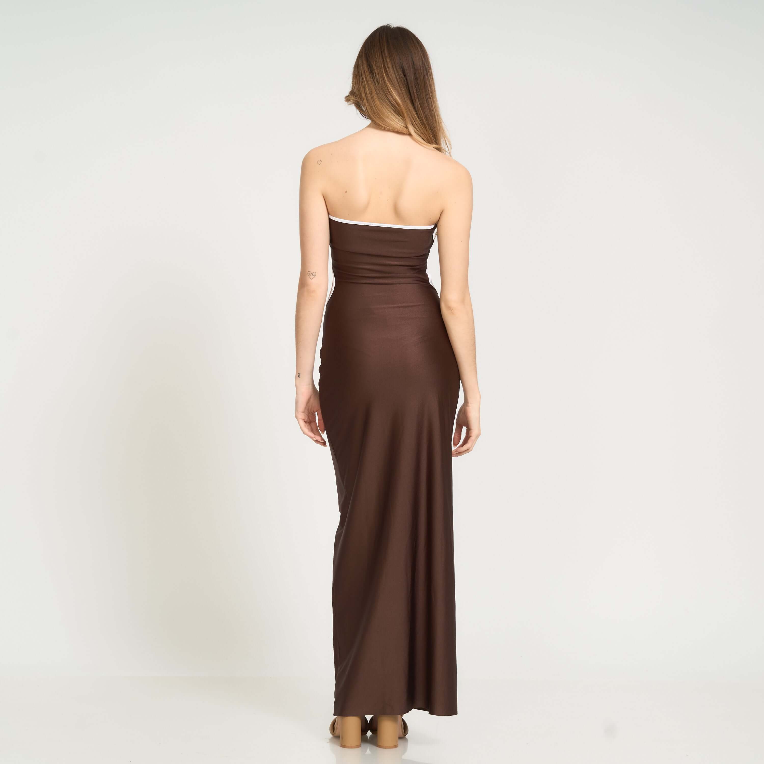 Meet the Isa Dress, your new go-to for effortless, versatile glamour. Designed in a rich chocolate shade with contrast trim in white, this strapless maxi adapts to you and your mood. Wear it with the cutout in the back for a sleek, minimalist look—or flip it and show the cutout in front for a bold, sexy twist. Two dresses in one.
