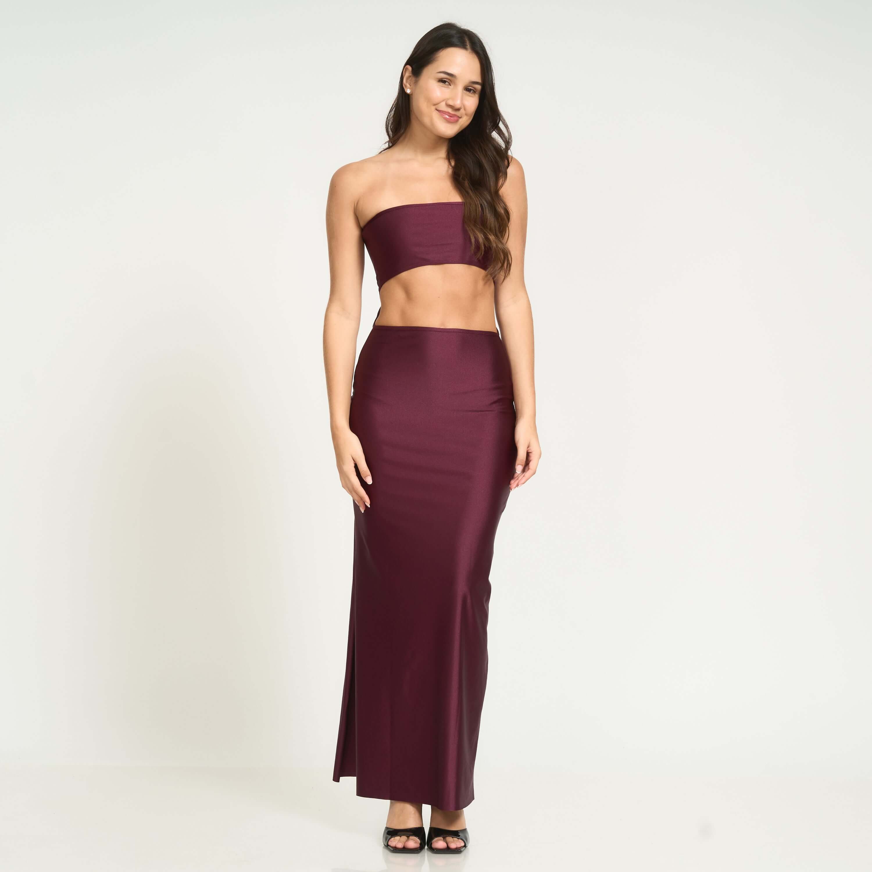 Made from our signature body-hugging lycra and fully lined for smooth support, the Isa molds to your curves without ever feeling restrictive. The bandeau top stays comfortably in place, while the long, clean skirt elongates your silhouette and features a subtle side slit for easy movement.
