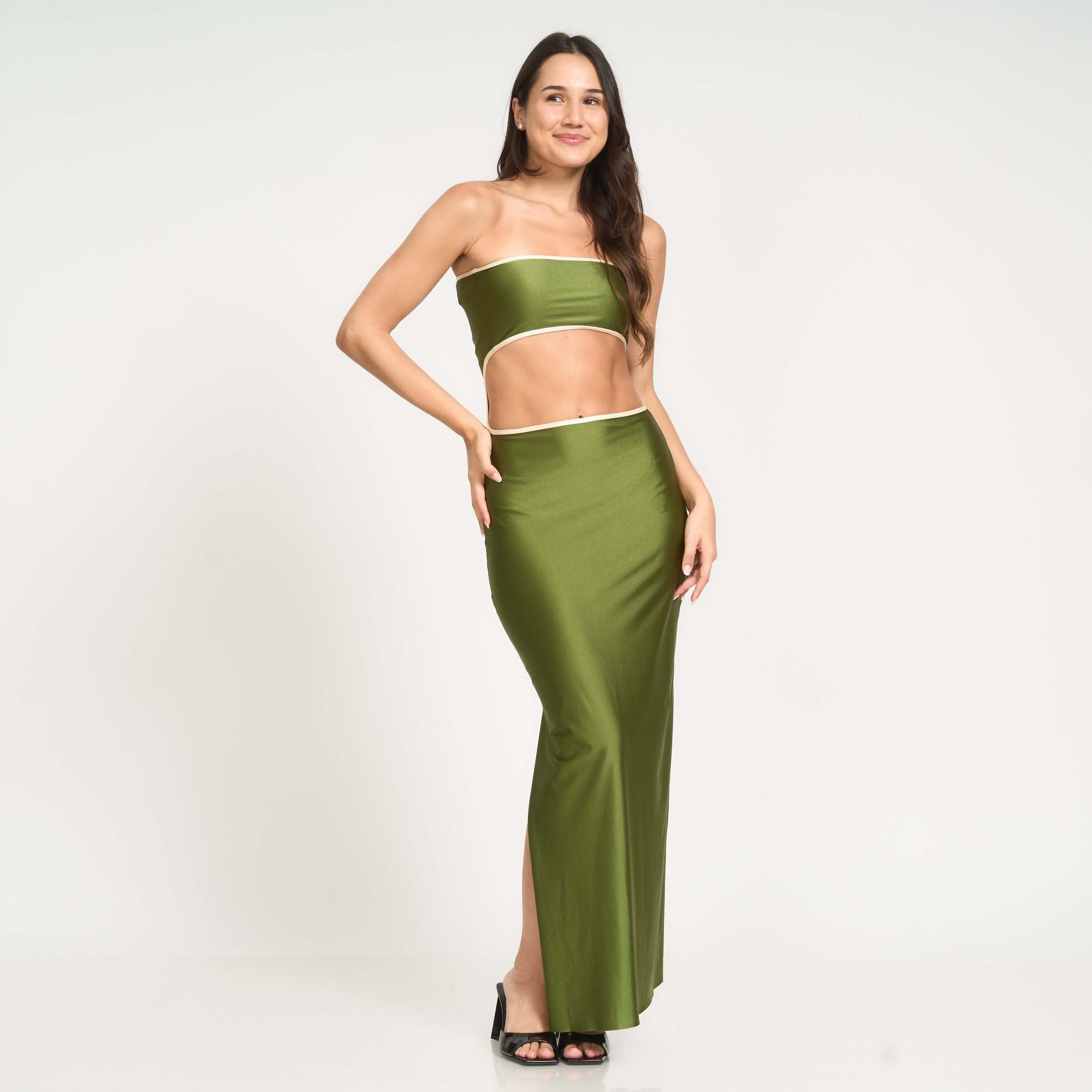 Meet the Isa Dress, your new go-to for effortless, versatile glamour. Designed in a stunning moss-green shade with contrast trim in white, this strapless maxi adapts to you and your mood. Wear it with the cutout in the back for a sleek, minimalist look—or flip it and show the cutout in front for a bold, sexy twist. Two dresses in one.
