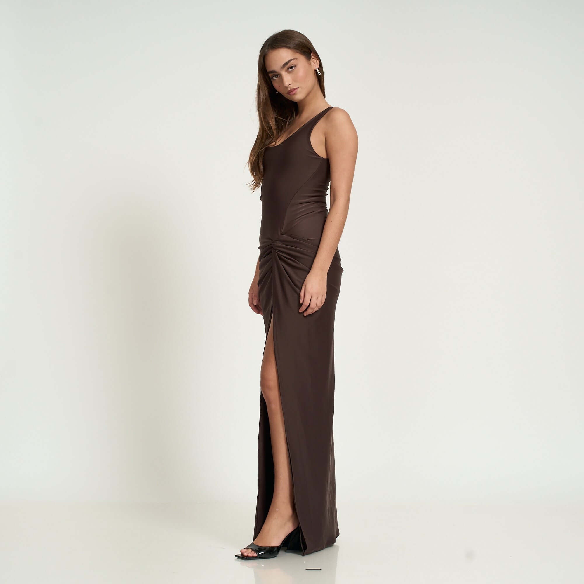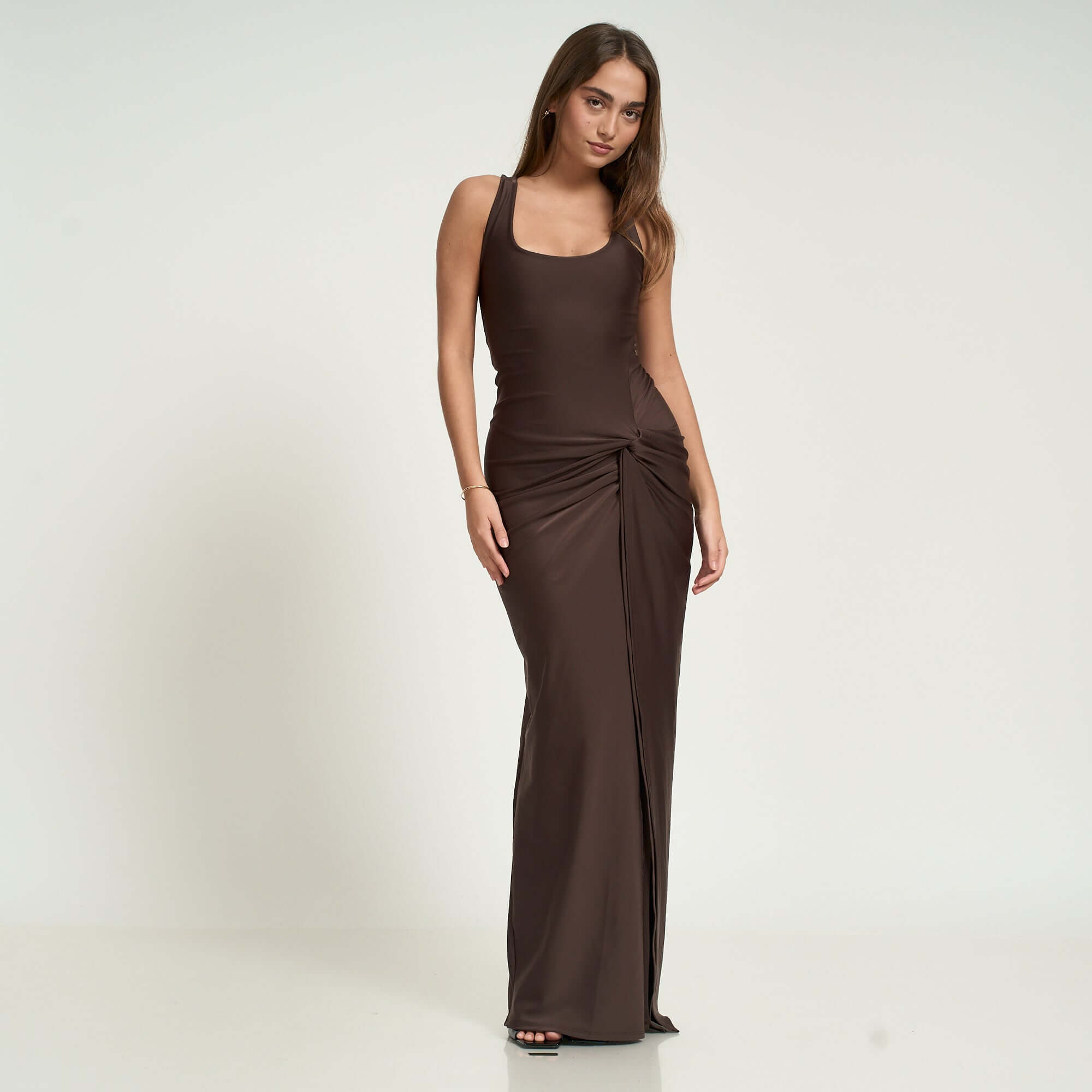 Step into timeless elegance with our Lea lycra maxi dress in Chocolate, designed with a sleek body-hugging silhouette and fully lined for a flawless fit. Featuring a daring high side slit with knot detail, this versatile piece transitions seamlessly from evening events to resort nights out. A chic essential from our exclusive collaboration with influencer Daniella Nuñez.