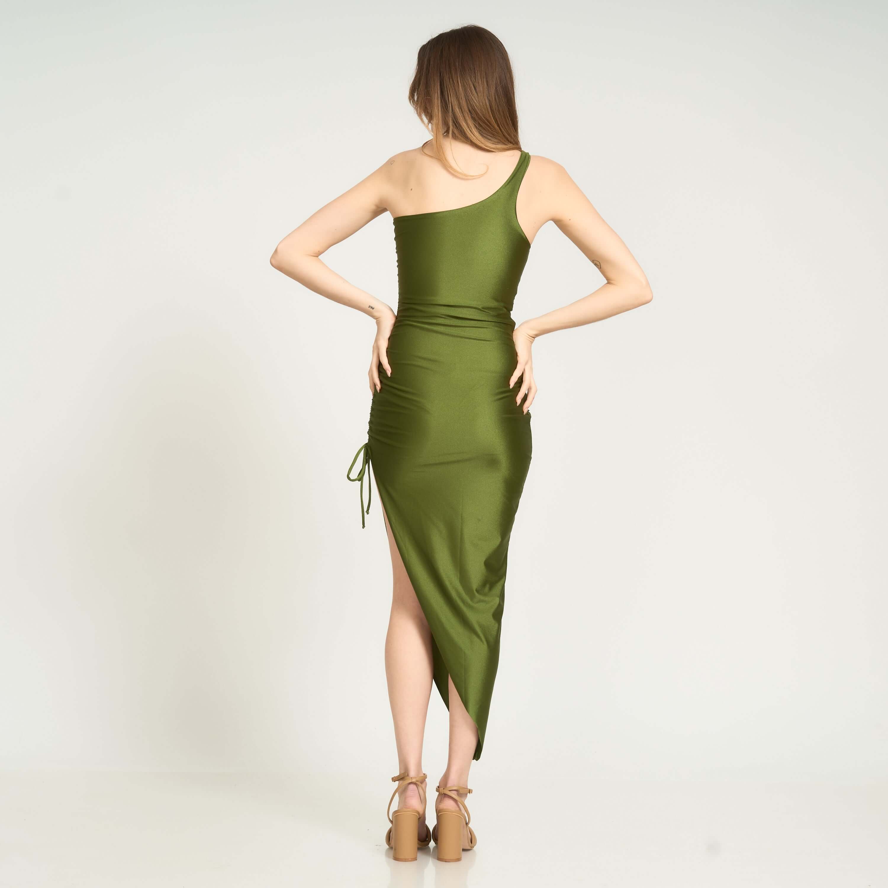 The asymmetrical neckline adds a modern, elevated touch, while the adjustable side ruching lets you customize your look. Pull it higher for a dramatic slit and a shorter length, or keep it relaxed for a cleaner, more classic silhouette. The diagonal hemline elongates your figure and creates that naturally flattering shape we love.