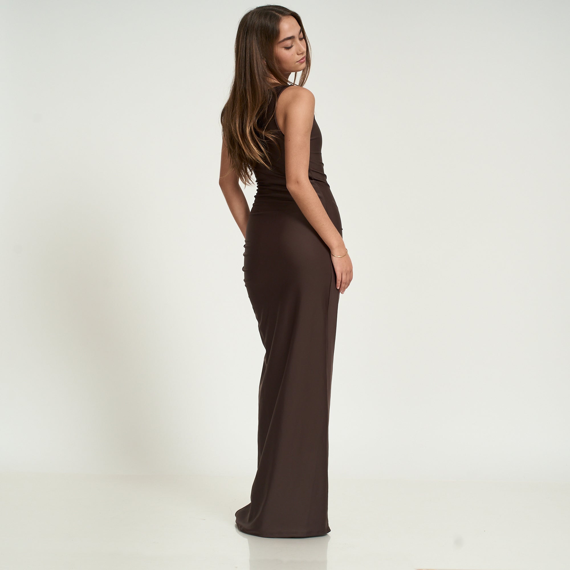 Step into timeless elegance with our Lea lycra maxi dress in Chocolate, designed with a sleek body-hugging silhouette and fully lined for a flawless fit. Featuring a daring high side slit with knot detail, this versatile piece transitions seamlessly from evening events to resort nights out. A chic essential from our exclusive collaboration with influencer Daniella Nuñez.