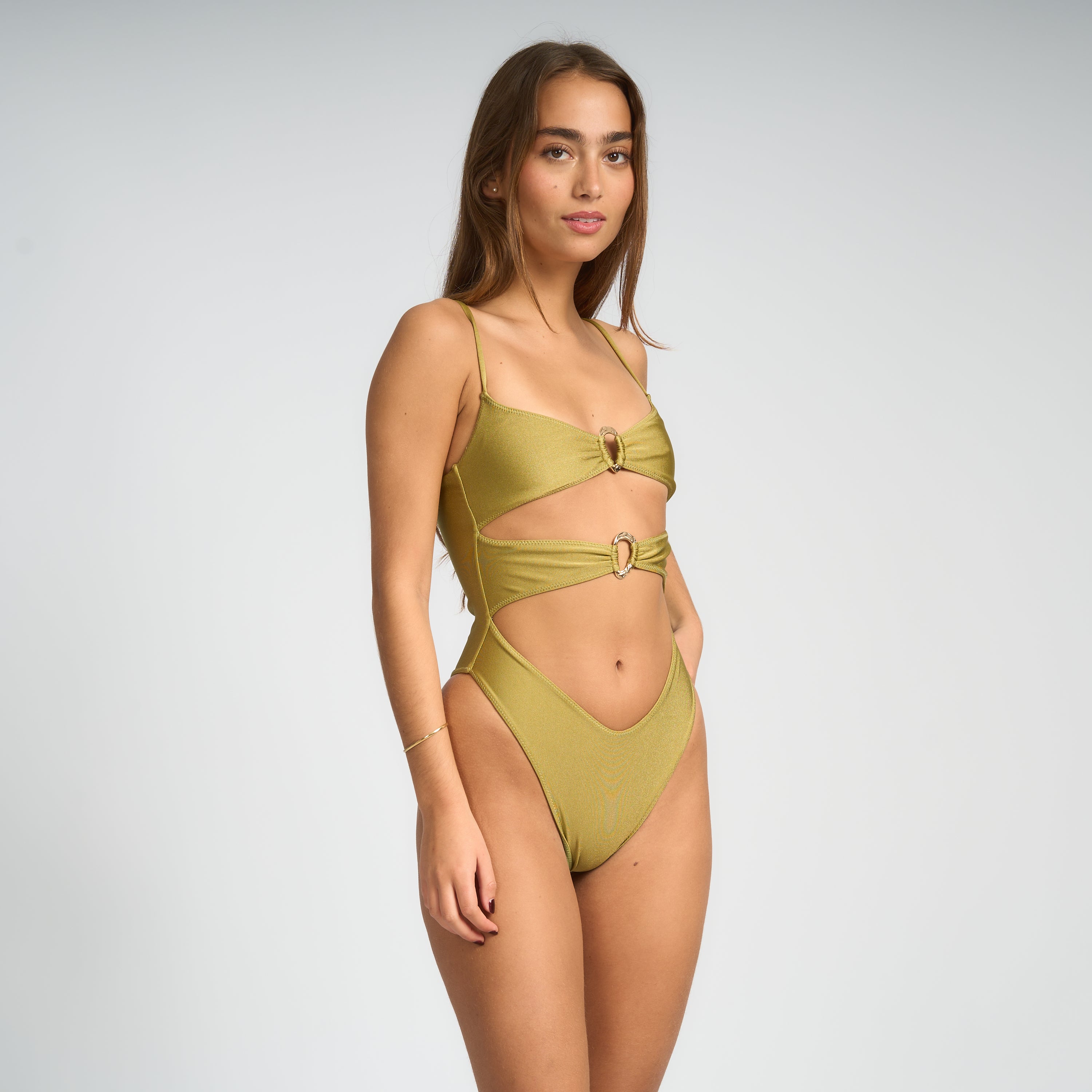 Introducing the Lima One Piece, a brand-new silhouette designed to make a statement. Crafted in a luxurious pistache-green shimmer fabric, this suit features bold cutouts, two gold-plated hardware rings, and a high-cut leg that accentuates your curves and elongates your shape.